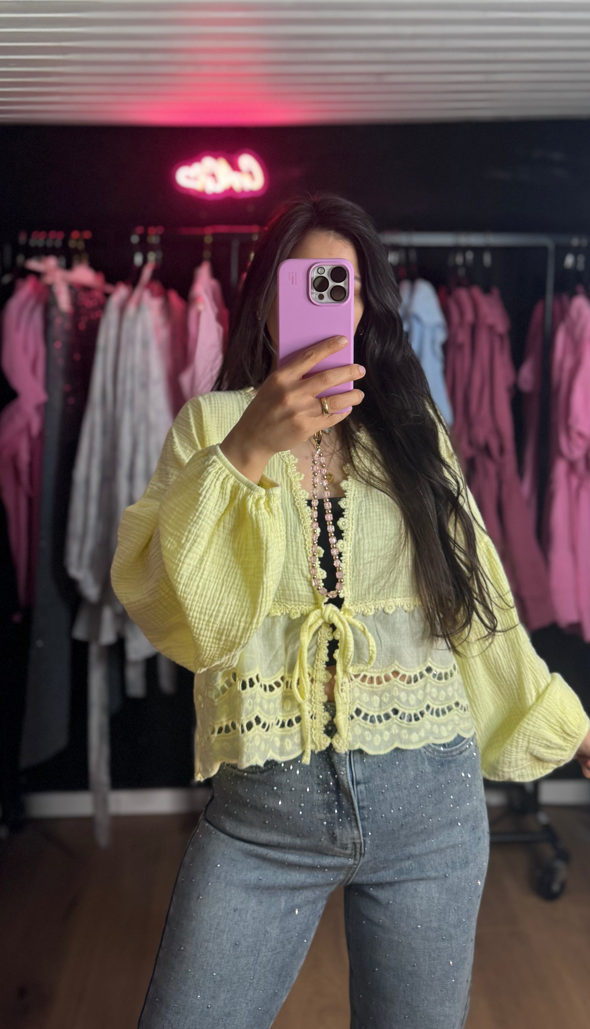 Häkel Musselin Bluse gelb